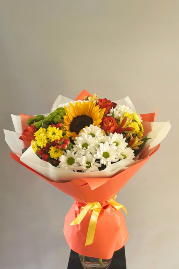 Букет: подсолнух, альстромерия, гиперикум, хризантема