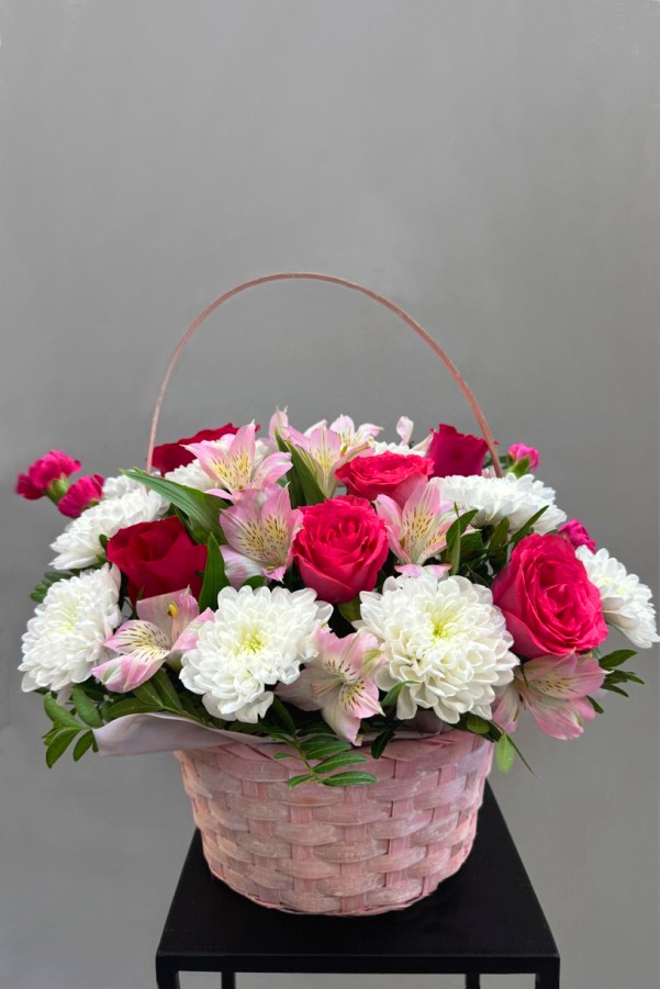 Композиция: гвоздика кустовая, роза, альстромерия, хризантема кустовая, фисташка
