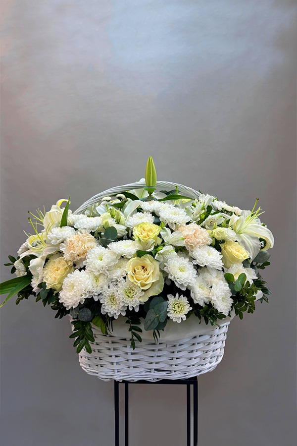 Композиция: хризантема, роза, лилия, диантус, альстромерия, фисташка, эвкалипт
