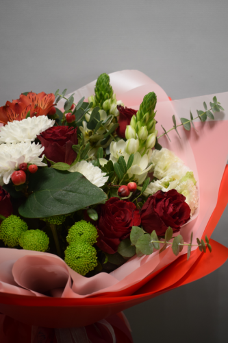Букет: хризантема кустовая, альстромерия, роза, диантус, лилия, фисташка, гиперикум, орнитагалум