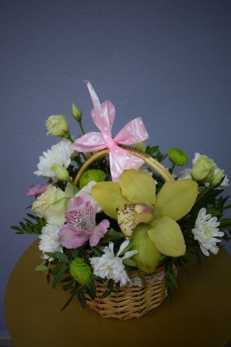 Композиция в корзине: диантус, альстромерия, хризантема, ...
