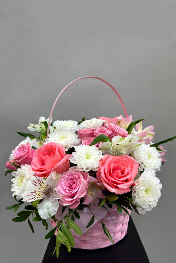 Композиция: роза, альстромерия, хризантема кустовая, зелень