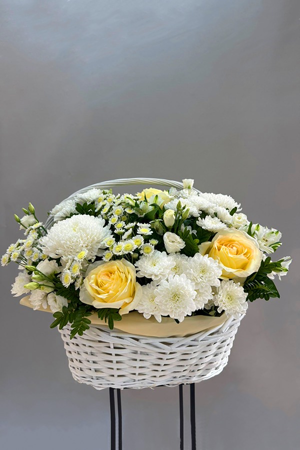 Композиция в корзине: роза, сантини, хризантема кустовая, хризантема магнум, альстромерия, эустома