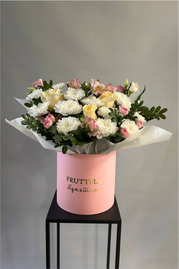 Композиция: роза, хризантема кустовая, альстромерия, эустома, фисташка