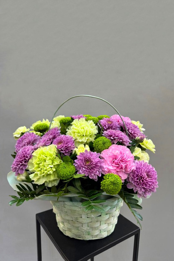 Композиция: хризантема кустовая, гвоздика кустовая, гвоздика одноголовая, зелень