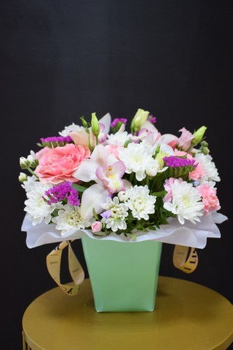 Композиция: орхидея, гвоздика, хризантема, роза, зелень